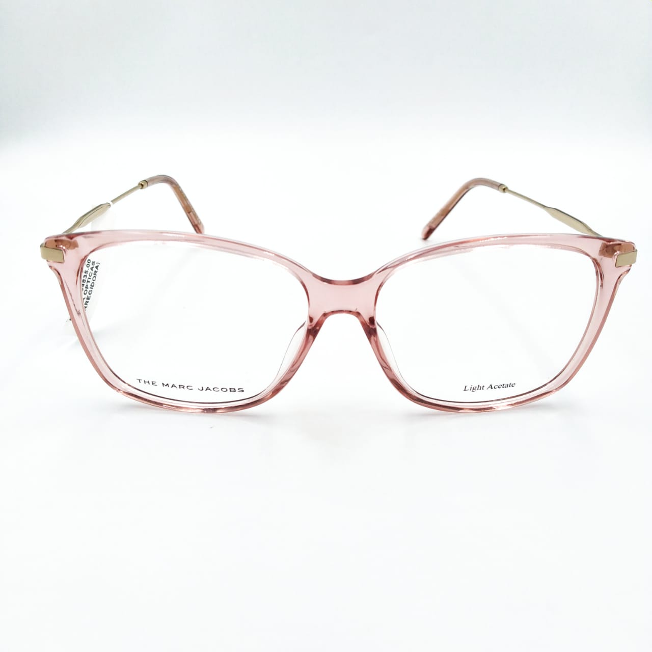 Armazón de acetato ligero al frente en color rosa traslúcido. forma amplia y cuadrada, varillas en metal dorado con logo de la marca en los laterales, terminales en acetato liso en mismo color